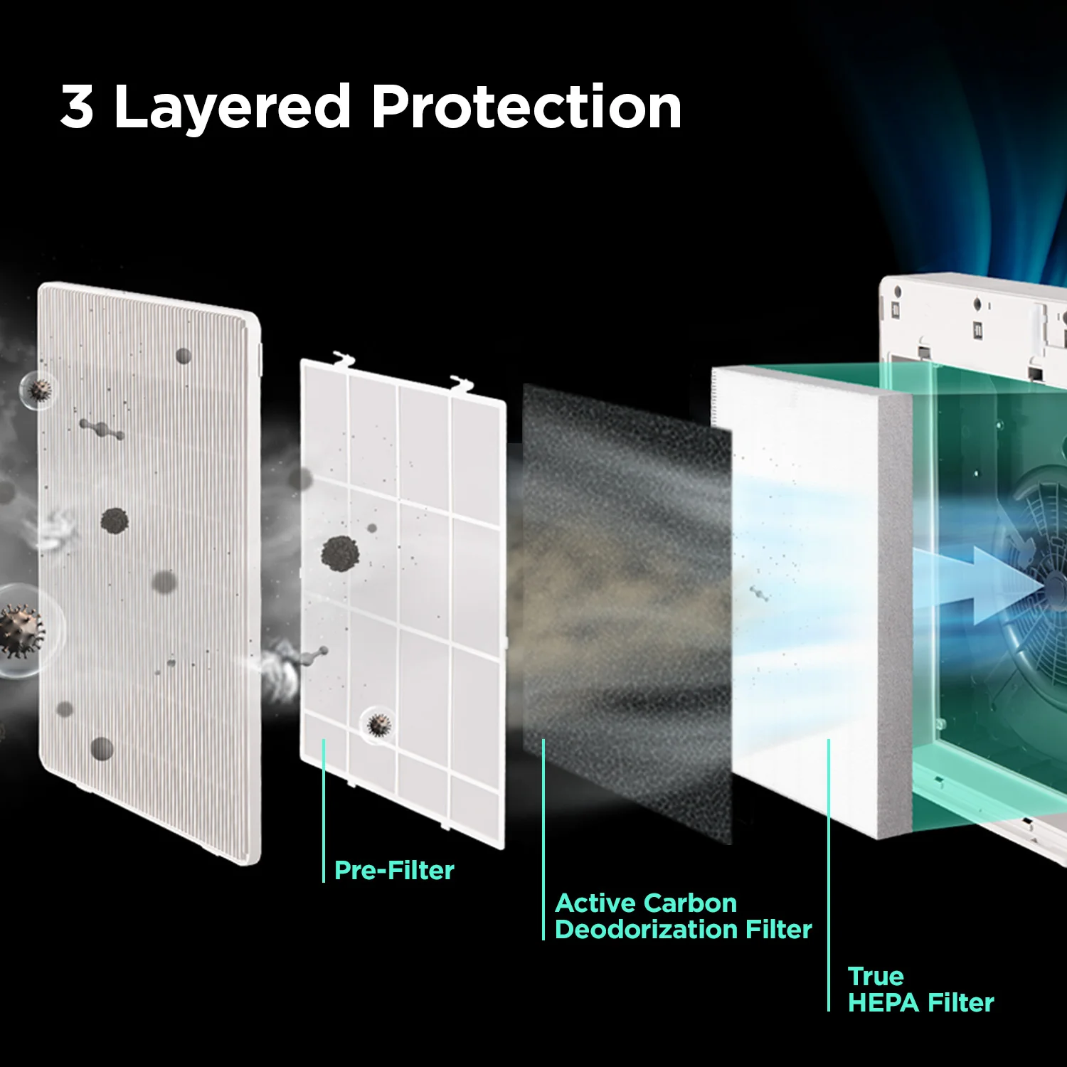 Pre-Filter, Activated Carbon Deodorization Filter, and H13 True HEPA Filter.